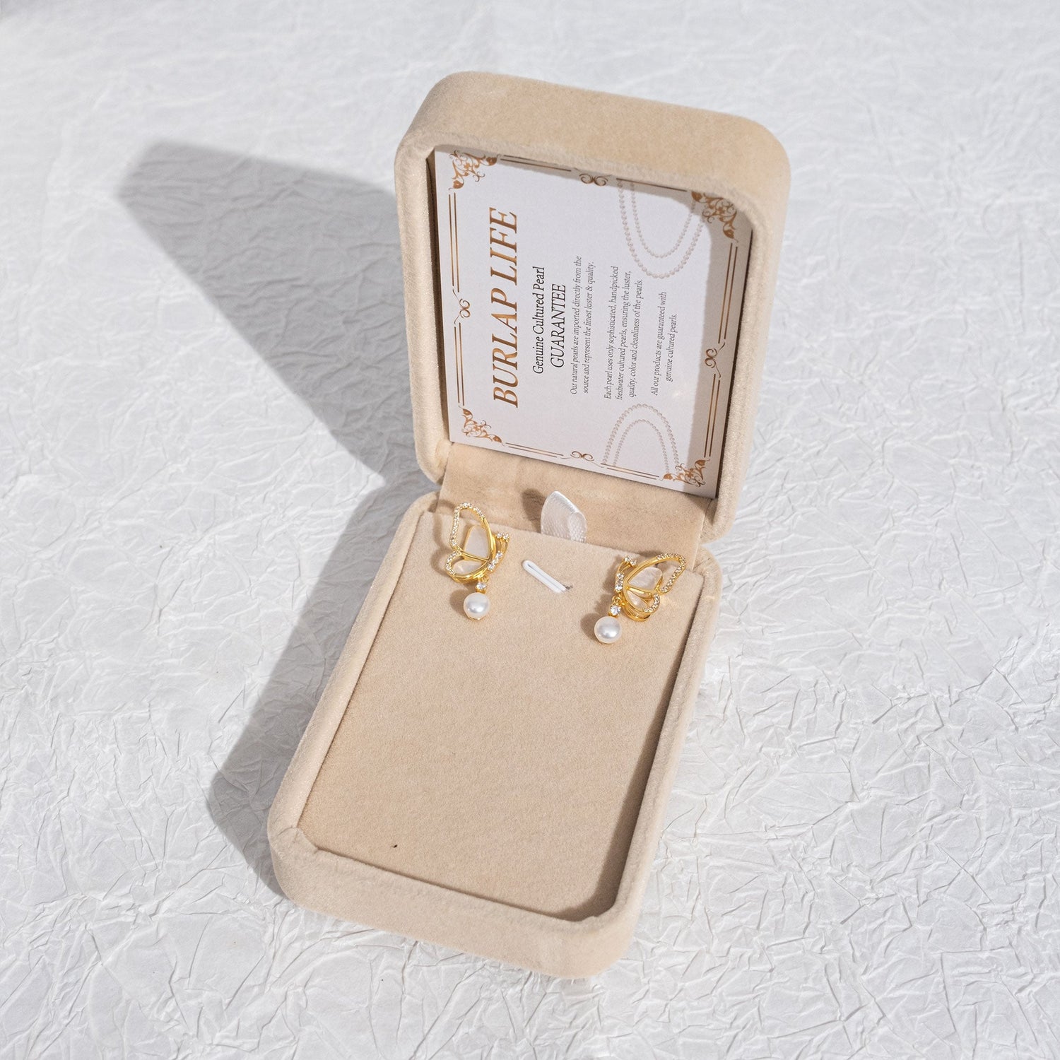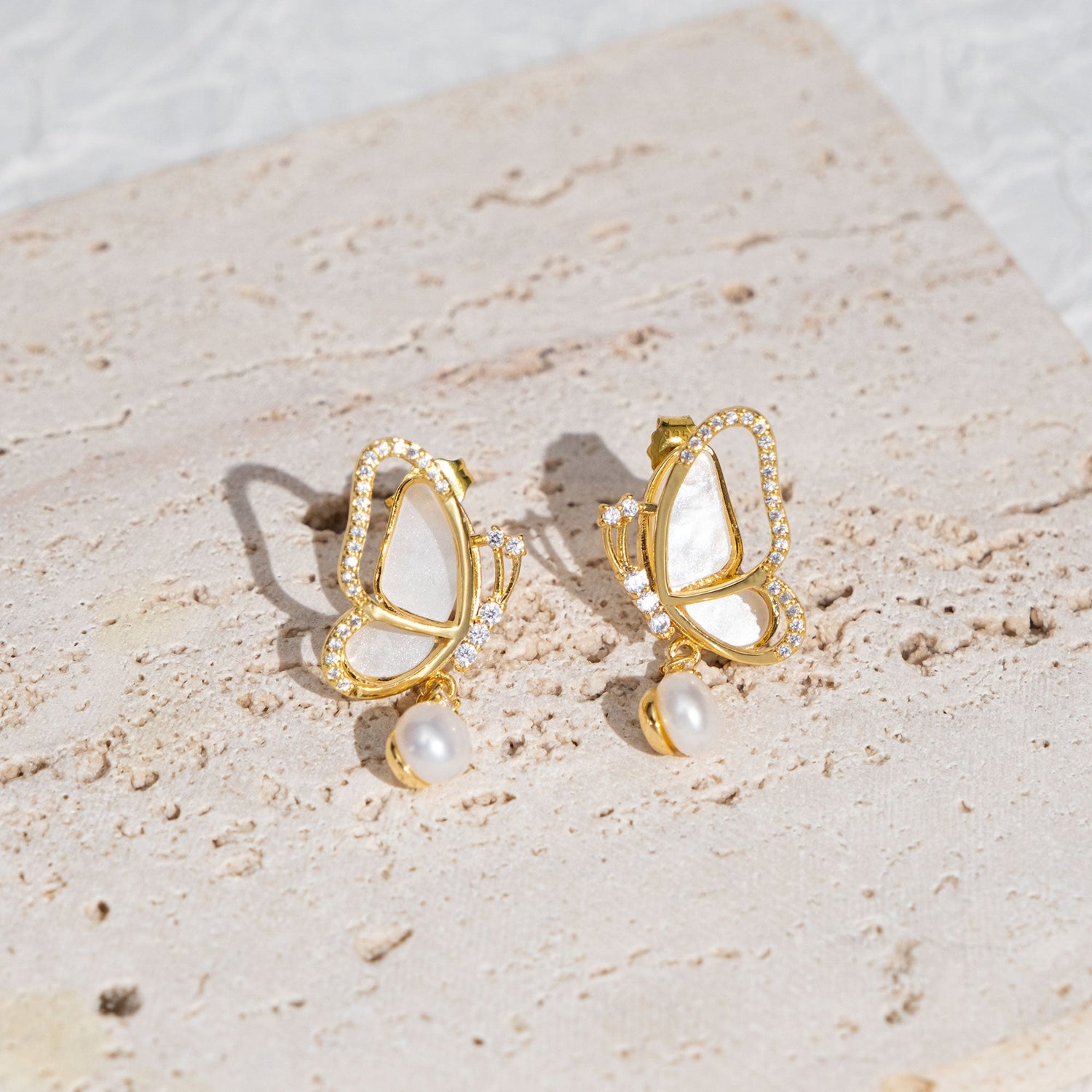 BURLAP LIFE Freshwater Pearl Mother of Pearl Earrings Gold Plated 925 Silver (Butterfly)
