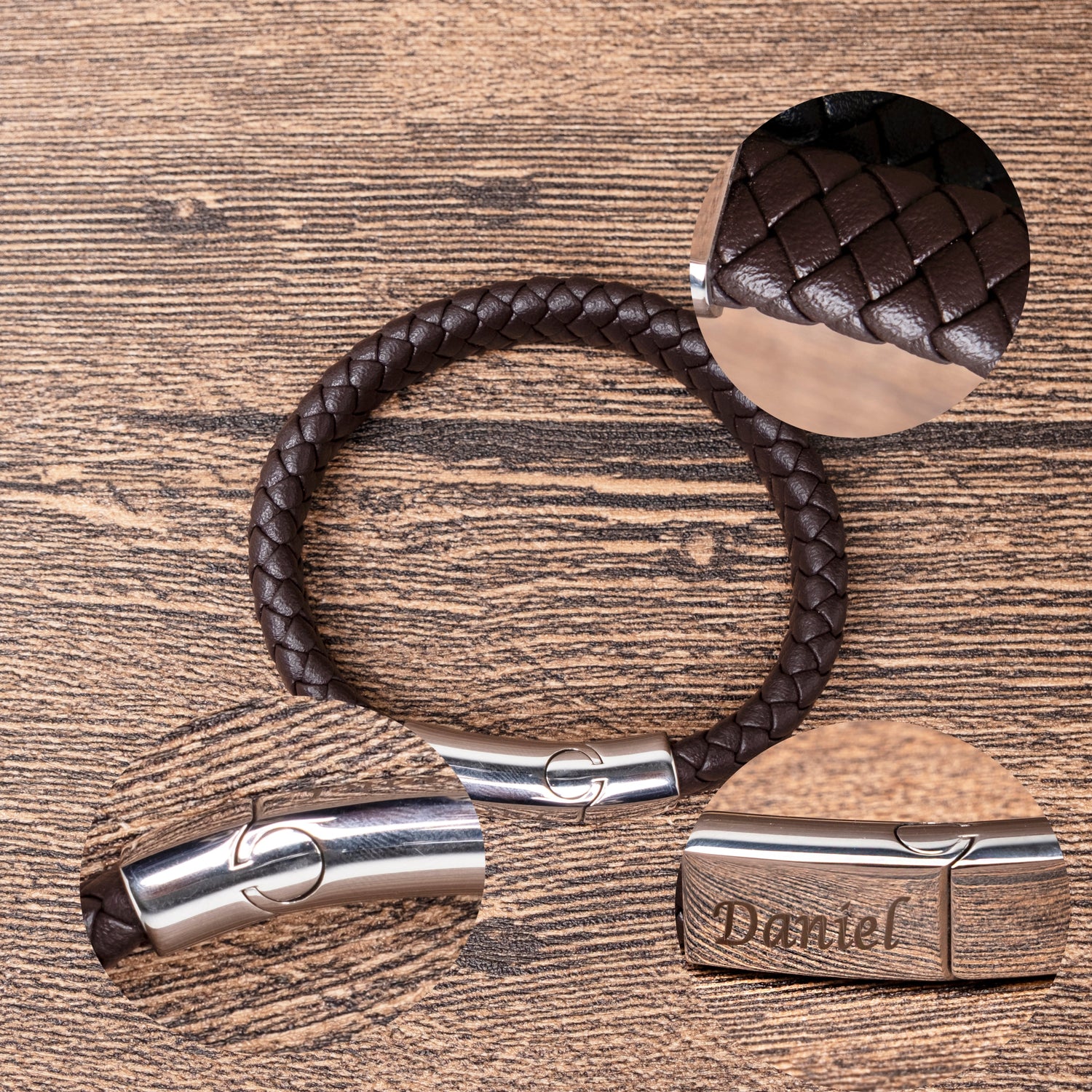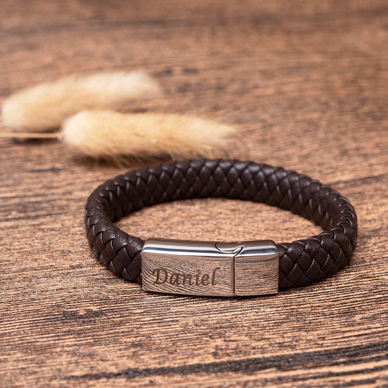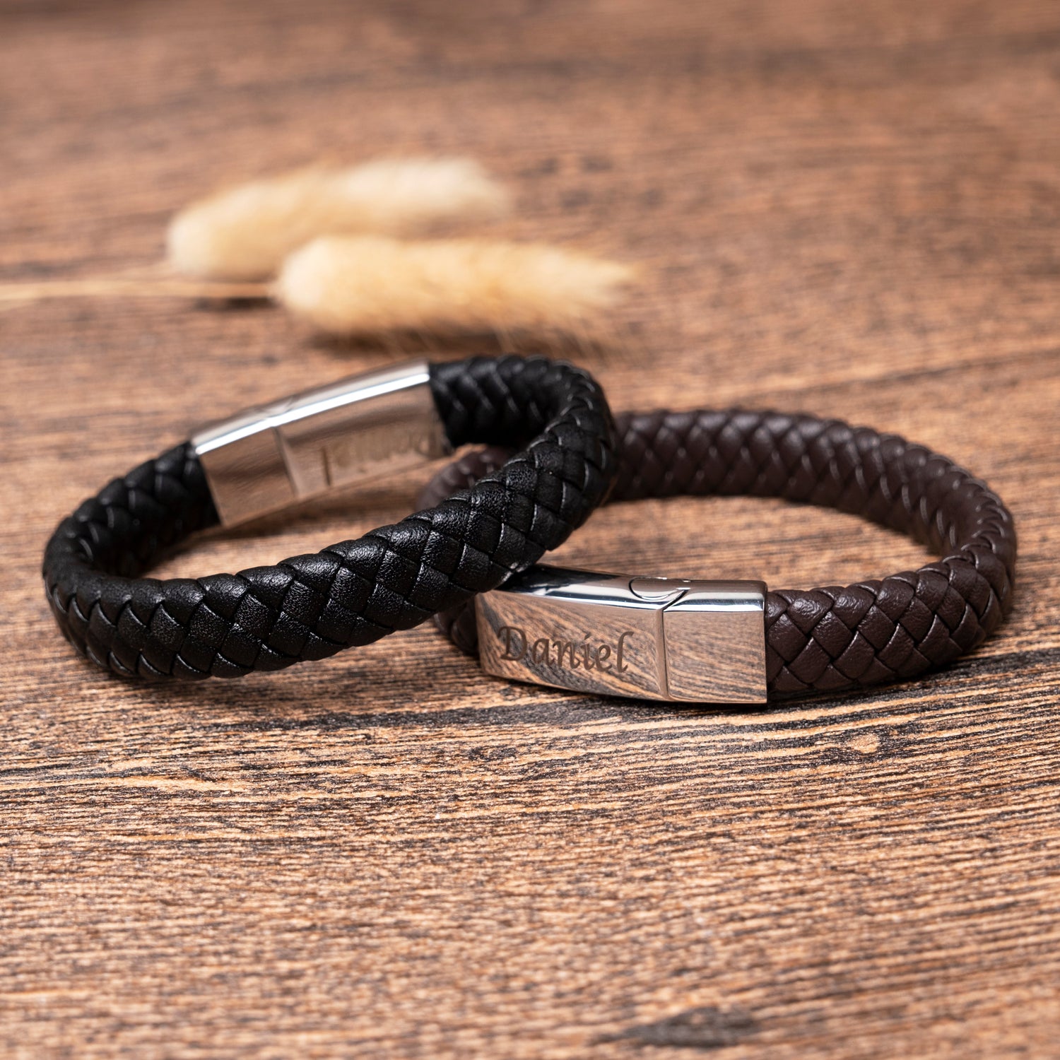 Adorned with laser-engraved details, this leather bracelet in classic black or brown is more than an accessory; it's a statement of style and personal connection.